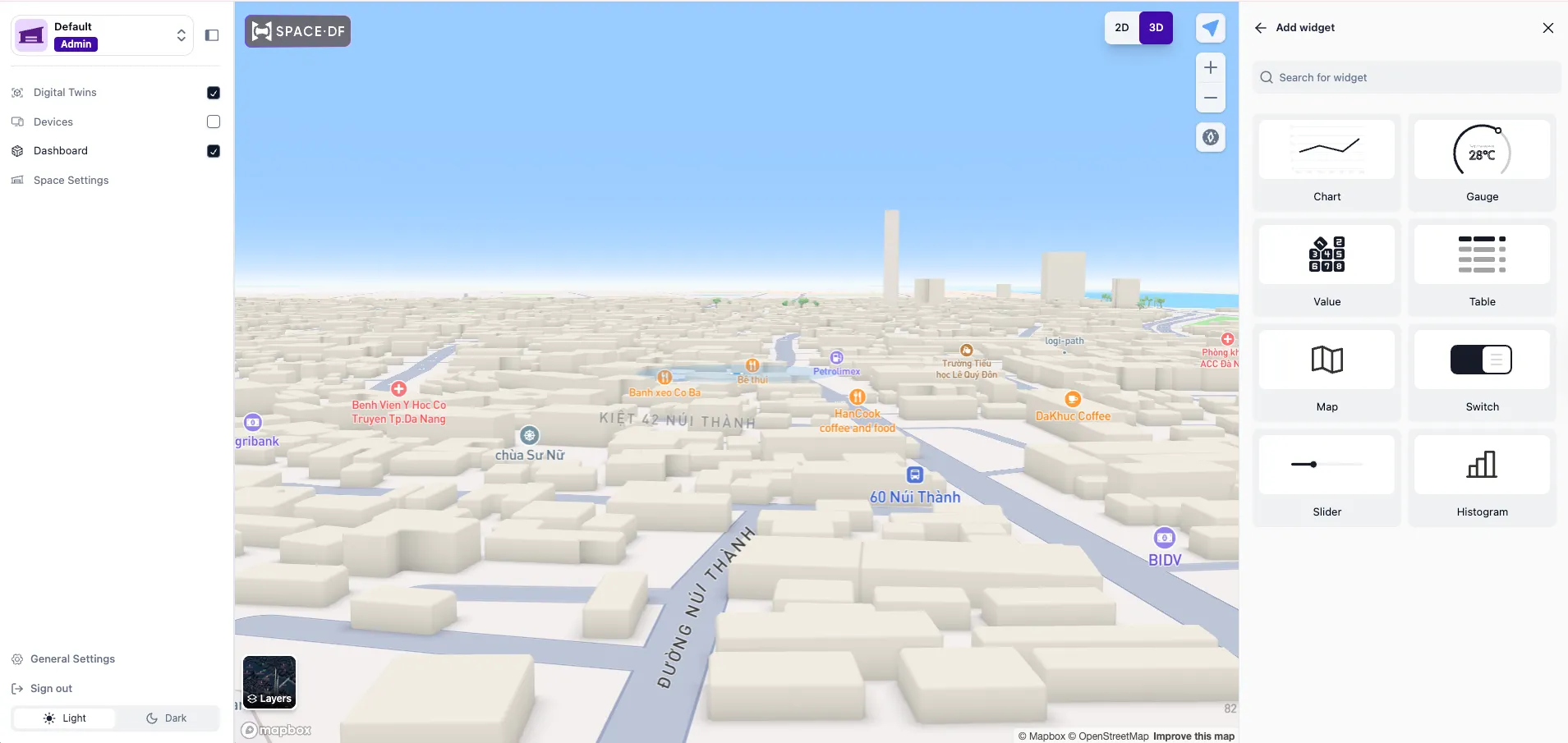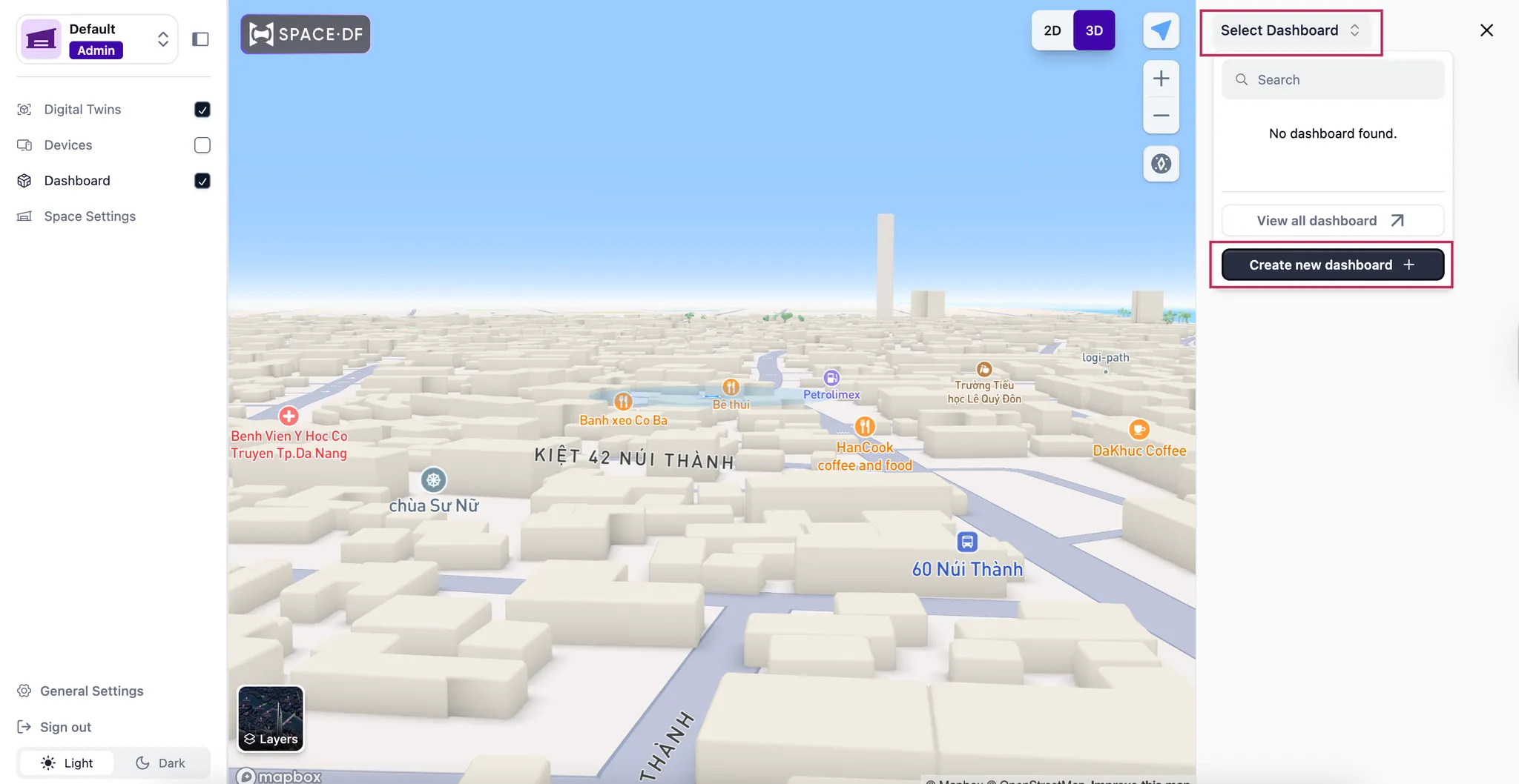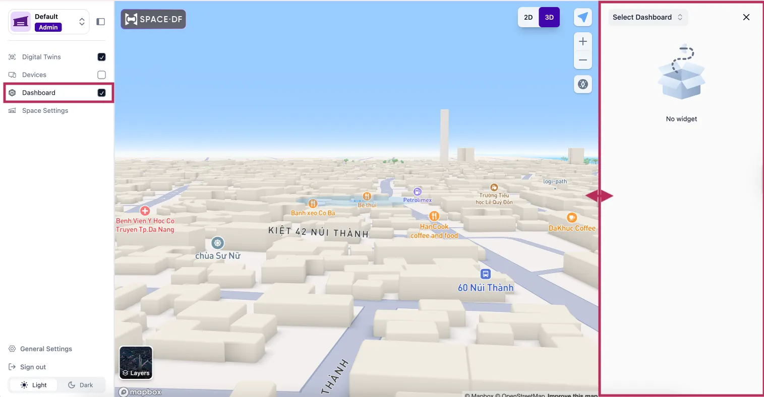 In the Space, you will see the Sidebar on the right side. This section allows you to select what to display, such as Digital Twins, Dashboard, or Devices. Tick the Dashboard to display the Dashboard section. You can easily collapse or expand the sidebar using the icon at the top.